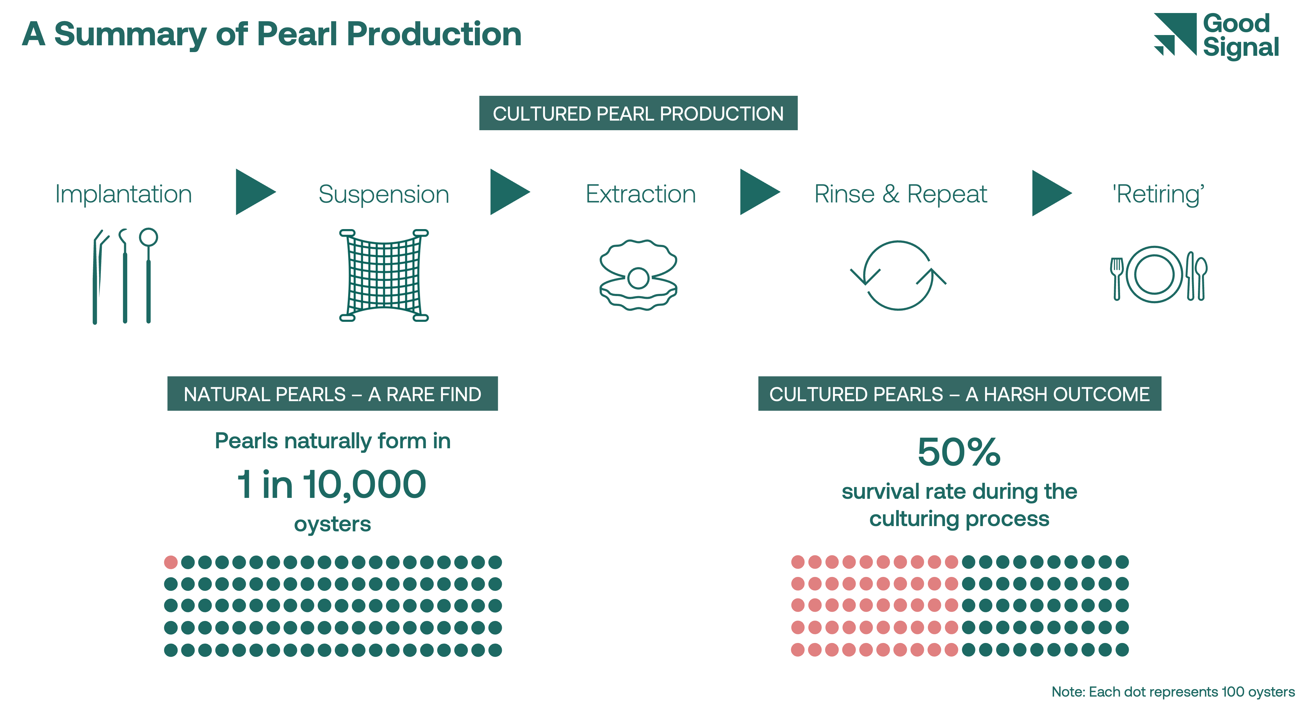 The culturing process itself results in the death of nearly half the oysters before they are even ‘retired’. While there are ethical pearls on the market made from glass, alabaster, plastic, or other non-animal materials, they tend to be coated in animal-derived materials, including isinglass, fish scales, oyster scales, and mother-of-pearl powder6.