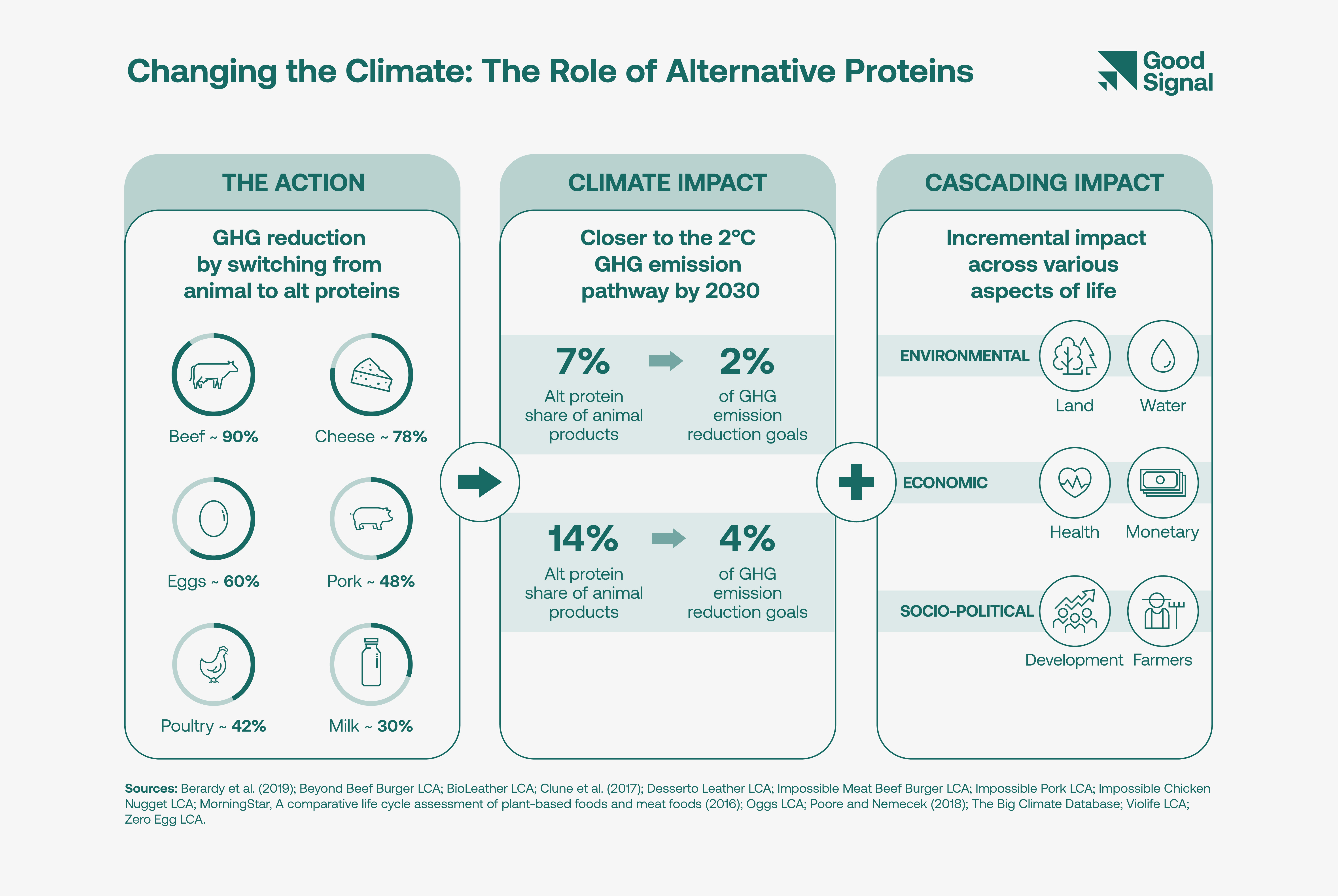 Plant-based meat currently commands 1.4% of the conventional meat market.8 Experts predict alternative proteins will command between 7% to 14% of the conventional animal agriculture market share by 2030.9 With a 7% market share, alternative proteins would contribute to 293 billion Kg of CO2e reduction which is equivalent to approximately 2% of the 15 GtCO2e emission gap identified for the 2°C pathway. At a 14% market share, they would contribute to twice the reduction in emissions. Although these projections are for plant-based meat alternatives and could differ for fermentation and cultivated meat technologies which are yet to come online in a meaningful way, they present a compelling argument to move toward a meatless future. It is no wonder that a report from BCG and Blue Horizon concluded that alternative proteins will save 3x the emissions for each dollar invested compared with the next best alternative (pun intended!).