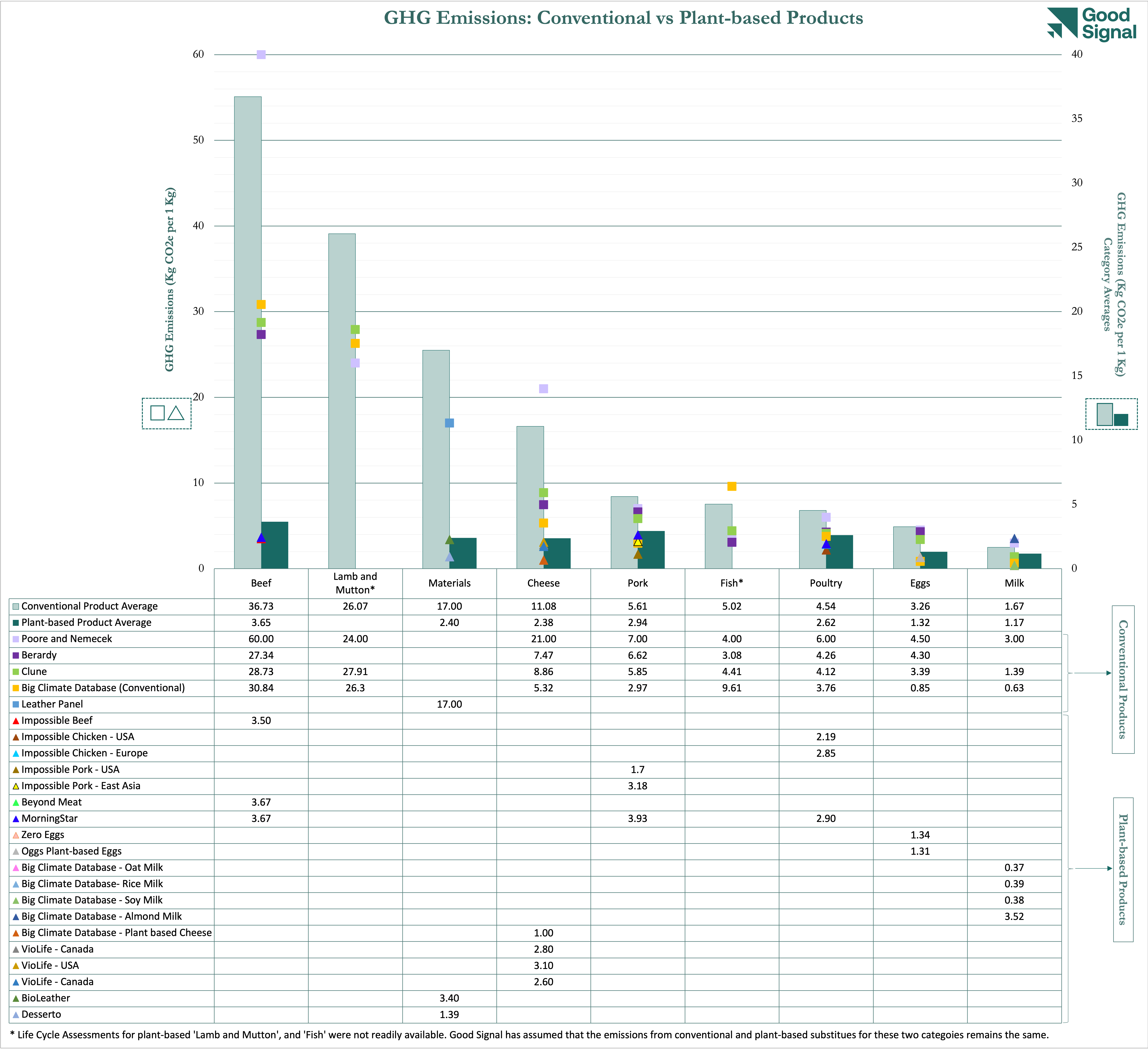 We currently emit 52.8 gigatons of CO2 Equivalent (GtCO2e) GHG emissions, a number which is predicted to grow to 58 GtCO2e by 2030.4 This will take us 15 GtCO2e away from the 2°C pathway and 23 GtCO2e away from the 1.5°C pathway.5 To meet the 1.5°C threshold, a 44% reduction in current emissions6 will be needed to achieve the targets – a herculean task. Our food system, which emits a third of global emissions, will play a crucial role. Animal agriculture amounts to a significant component at 14.5% of total global emissions, a major culprit in food system emissions. When we compare animal products to their plant-based counterparts, we find that on average, GHG emissions from plant-based products are 30-90% lower than conventional products.7 Beef and cheese alternatives lead to higher emission reductions as compared to poultry, but the percentage reductions are quite significant across the board.