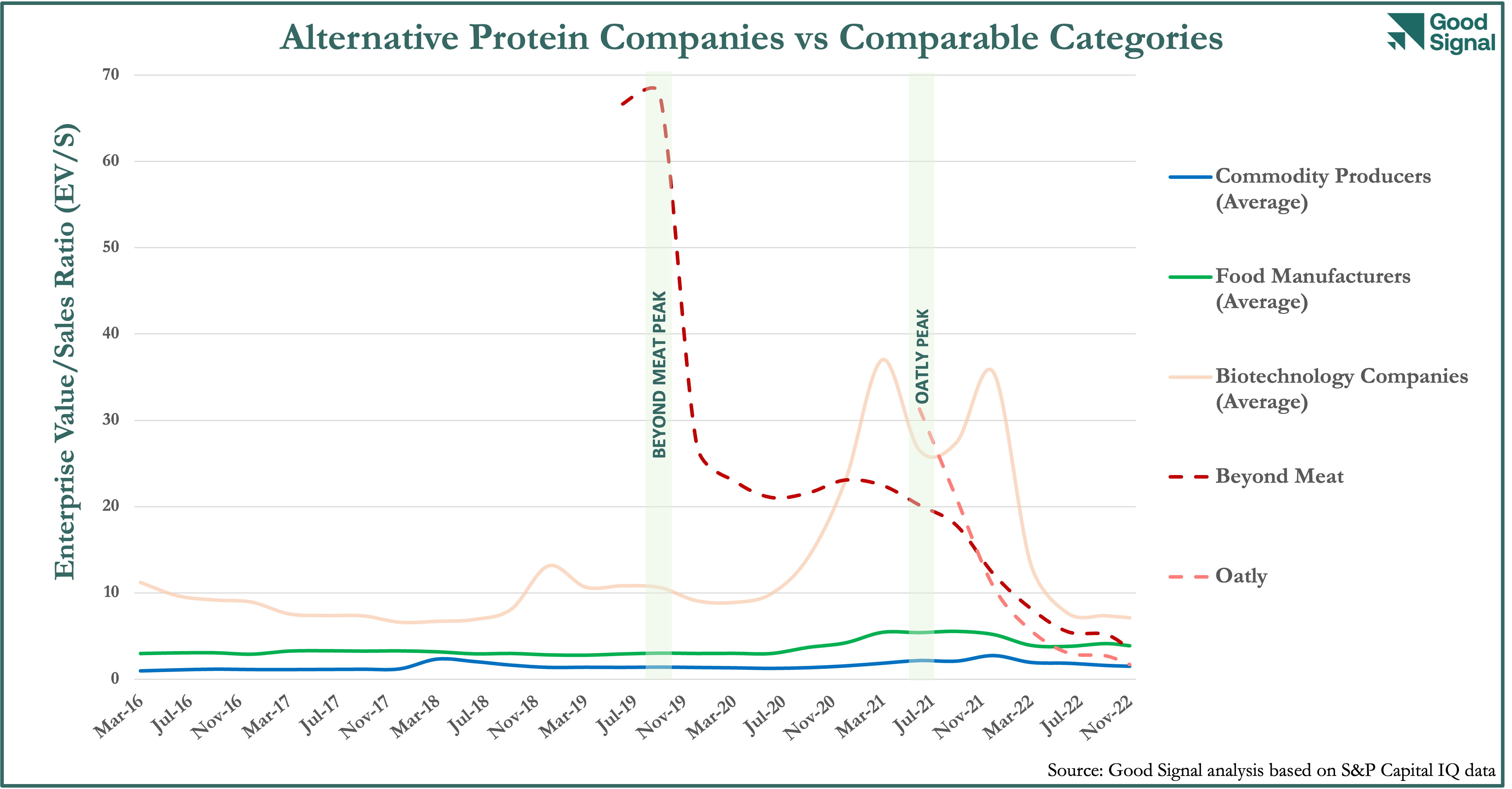 Next, we charted how the EV/S of these three categories changed over the past five years through the recent economic exuberance and the subsequent downturn, and compared them to the EV/S of Beyond Meat and Oatly, the two most visible public companies in the alternative protein sector.