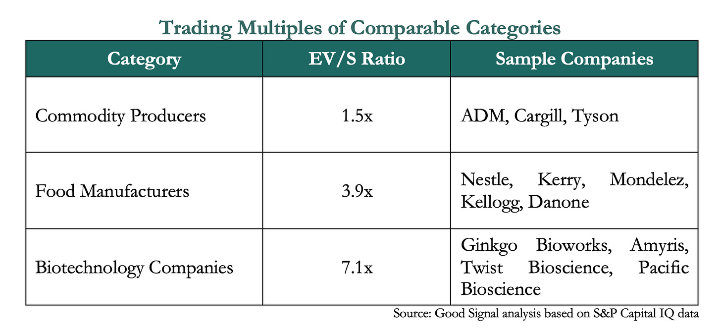 The alternative protein sector is often referred to as ‘food-tech’. That is, it falls at the intersection of food and biotechnology sectors. To better understand the valuations of alternative protein companies, we reviewed the Enterprise Value to Sales ratio (EV/S)10 of companies across three related categories – commodity producers, food manufacturers, and biotechnology companies. EV/S compares a company’s total worth to its sales. Simply stated, an EV/S of 4x means that a company is worth $40 million if it is generating revenues of $10 million. Here are EV/S ratios of categories comparable to alternative proteins:
