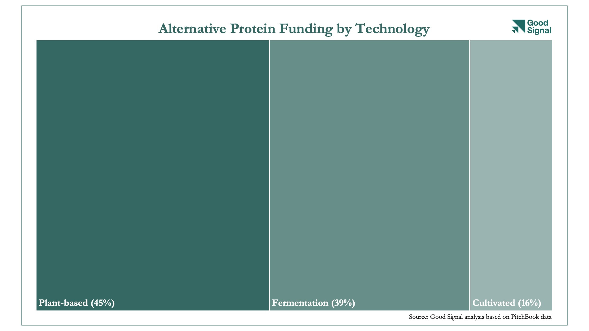 Plant-based technology has been the clear leader with 45% of the funding, followed by fermentation at 39% and cultivated at 16%. Plant-based has enjoyed a first mover advantage, but recent funding trends have placed investor hopes in the fermentation and cultivated technology stacks to create products consumers will love.