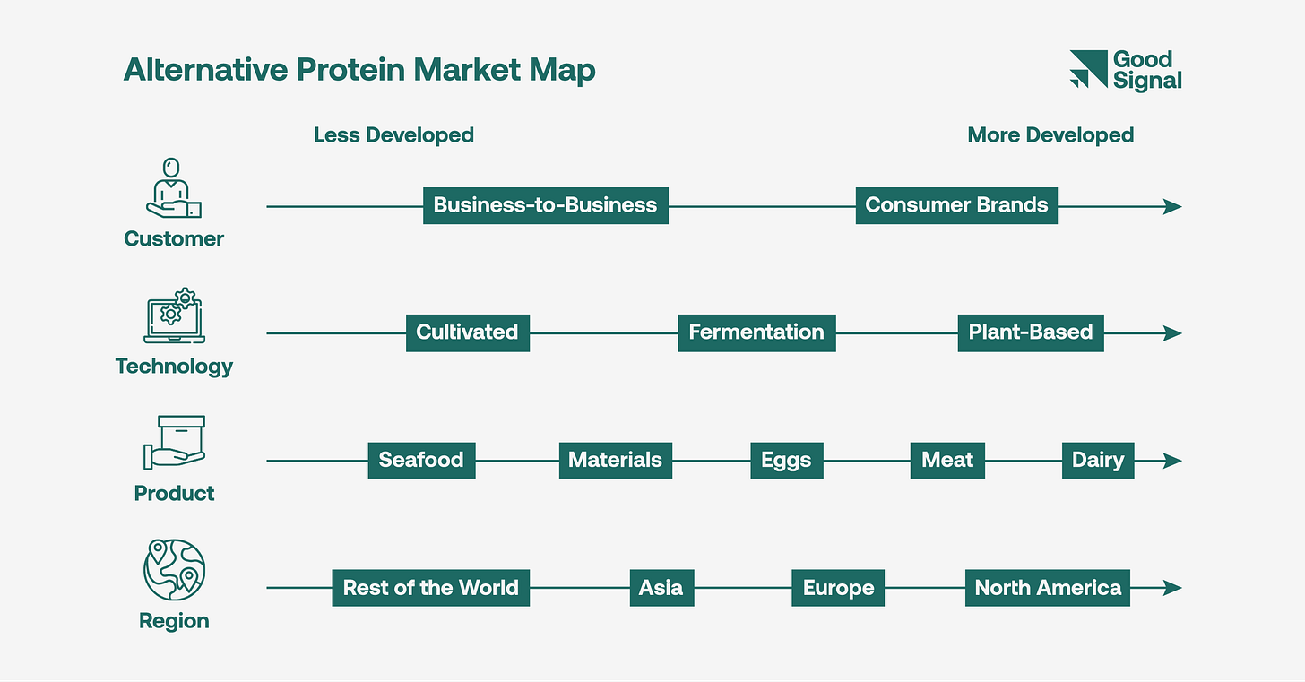 The alternative protein “market map” below provides a snapshot of the current state of the alternative protein industry across four key vectors: (1) Customer; (2) Technology; (3) Product; and (4) Region, showing their relative development.