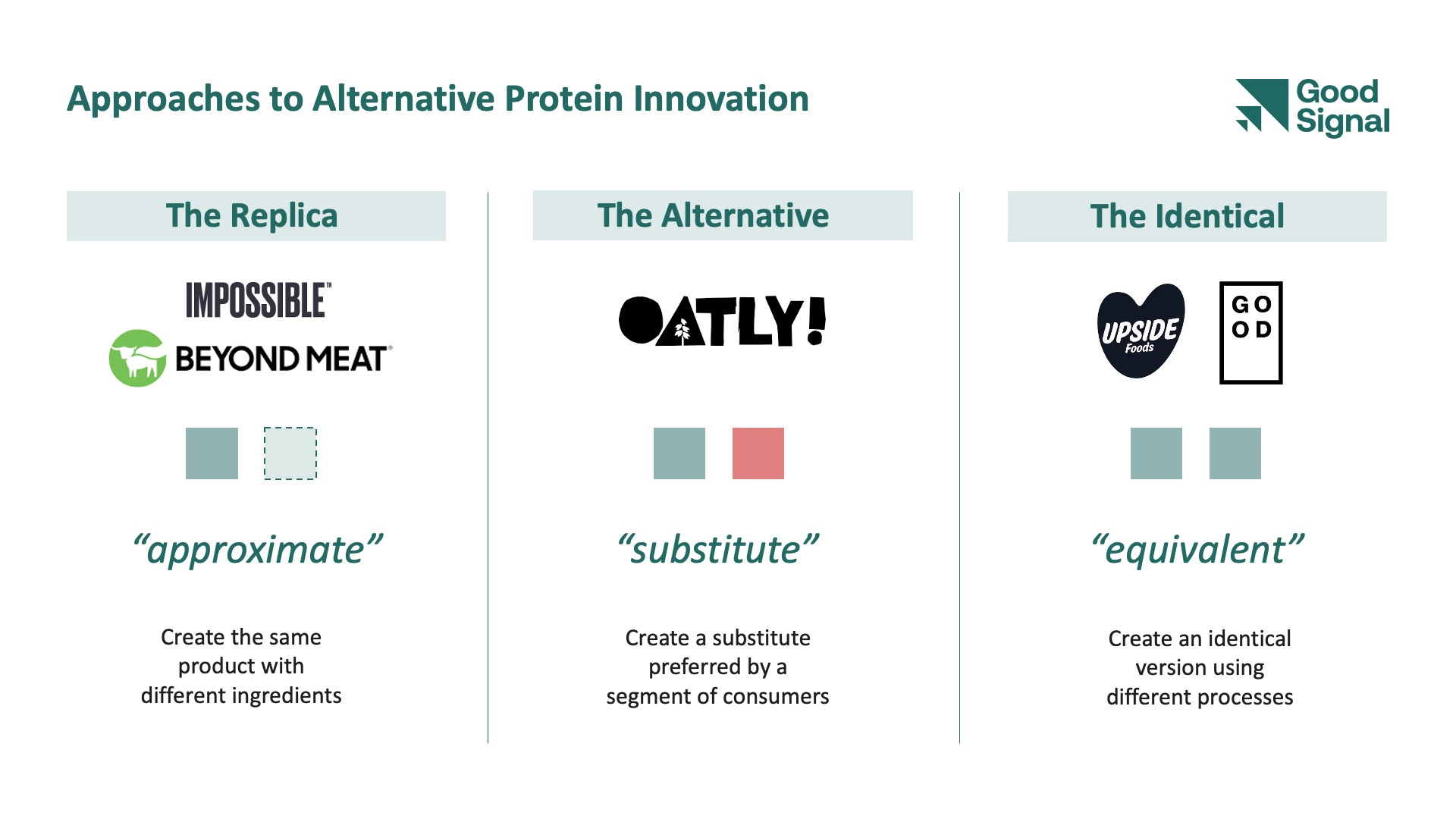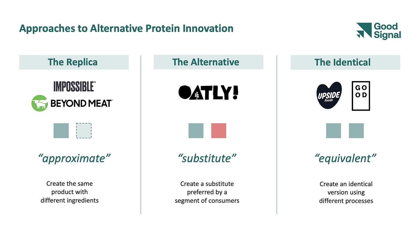 The Identical: A third set of companies are synthetically creating products that are bio-identical to animal products. Cultivated meat companies such as Upside Foods and Good Meat are among the most prominent examples of companies creating identical products.