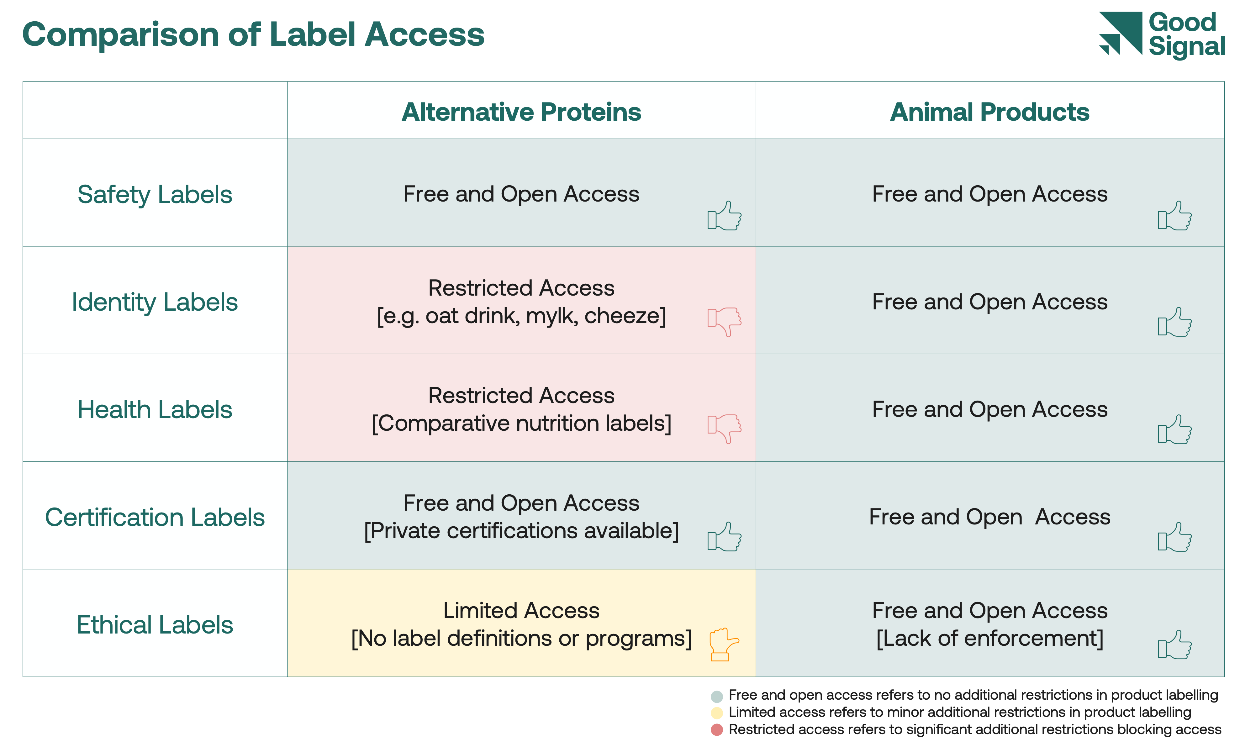 Animal products and alternative proteins are intended to be substitutes for one other, but access to labels is vastly different for the two industries. The animal products category is governed by regulations that give the industry far more power and flexibility compared to the alternative protein sector. Ideally, both industries should have fair and balanced access to labels, should be able to communicate with consumers, allow them to compare products, and make the best choice from a variety of alternatives.